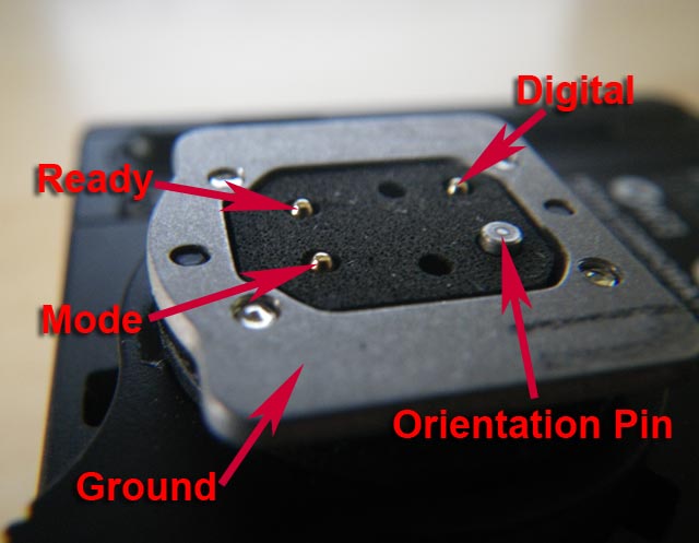 On the Hot Shoe part, all of the contacts are spring loaded - even the orientation pin. In the image below, the orientation pin is the larger pin in the upper left.