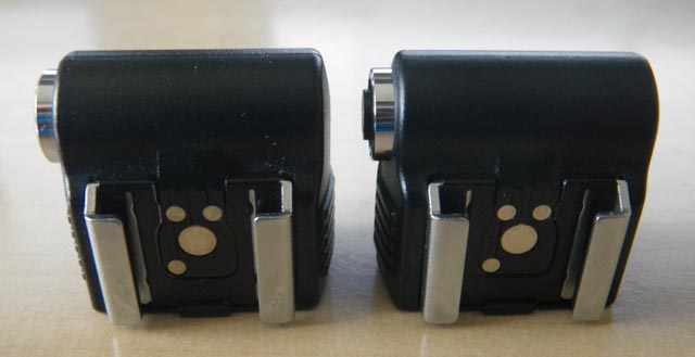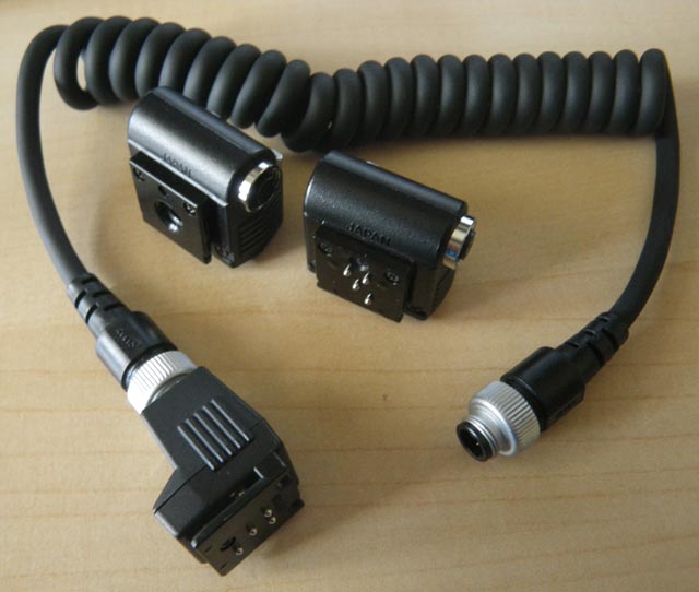 The Hot Shoe adapter Fg is still connected to the F5P cord, and the two versions of the F adapters are next to each other.