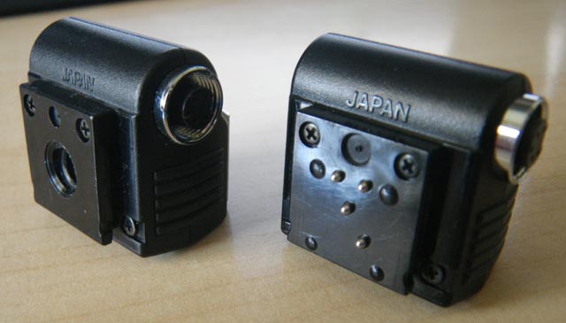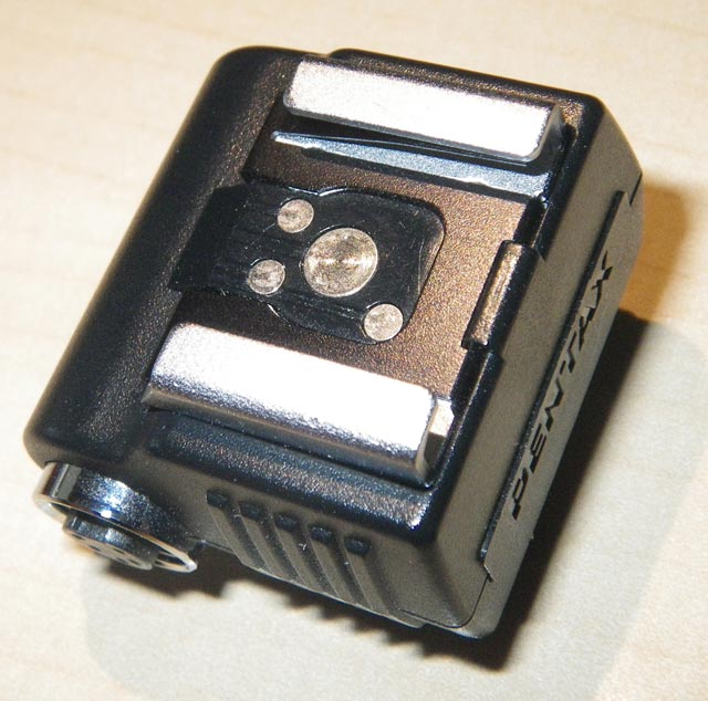 In the image below, are two Hot Shoe Adapters. The Hot Shoe Adapter F comes in TWO versions. One with contacts on the bottom, and one with a 1/4-20 socket (Tripod Socket). The Pentax Stock Numbers are 31046 - for the Tripod one, and 31022 - for the contacts one. The one with the tripod socket is usually more expensive.