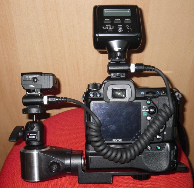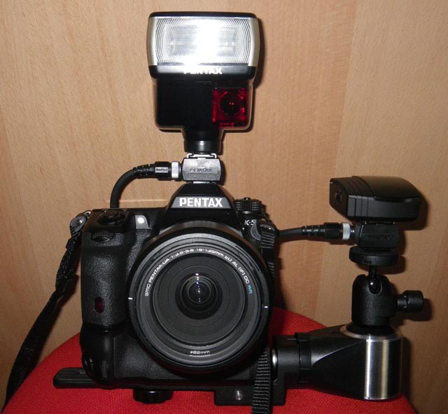 I used a 2 Pentax Hot Shoe Adapter F and a F5P flash cord.